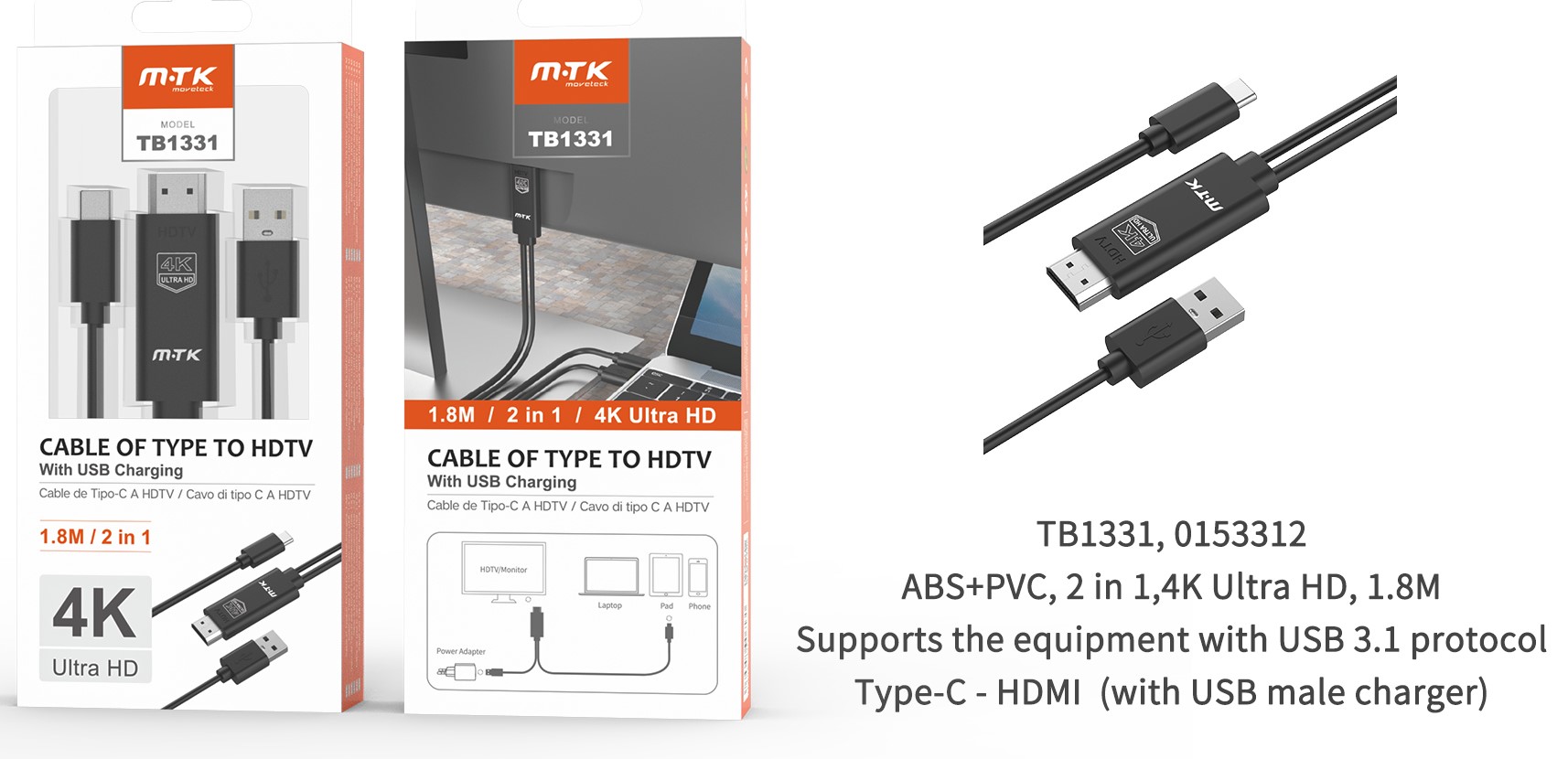 Cable adaptador Type-C a HDMI 4K + USB macho / TB1331 / 1.8m / Negro / Mtk