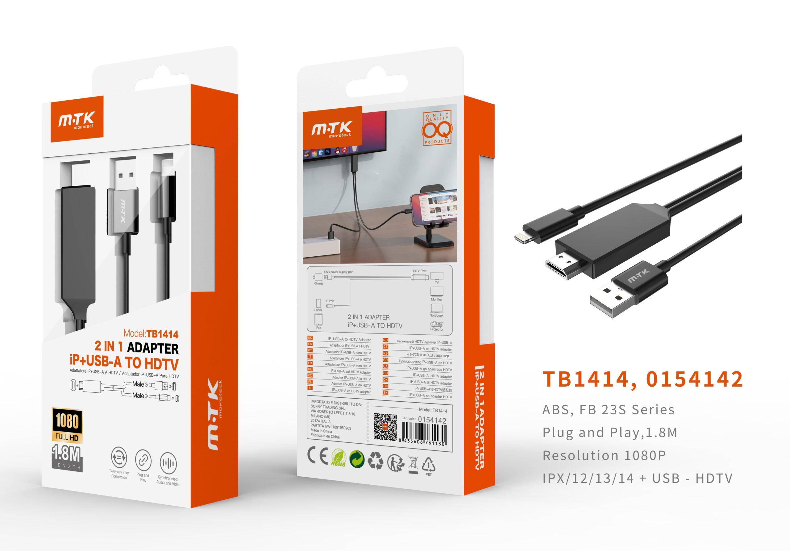 TB1414 NE Adaptador 2 en 1 Lightning( Macho) a HDMI+USB 2.0(Macho), 1080P
