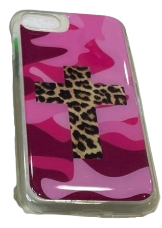 Funda Resina antideslizante, diseño cruz color leopardo, fondo rosa .Para la protección del movil.