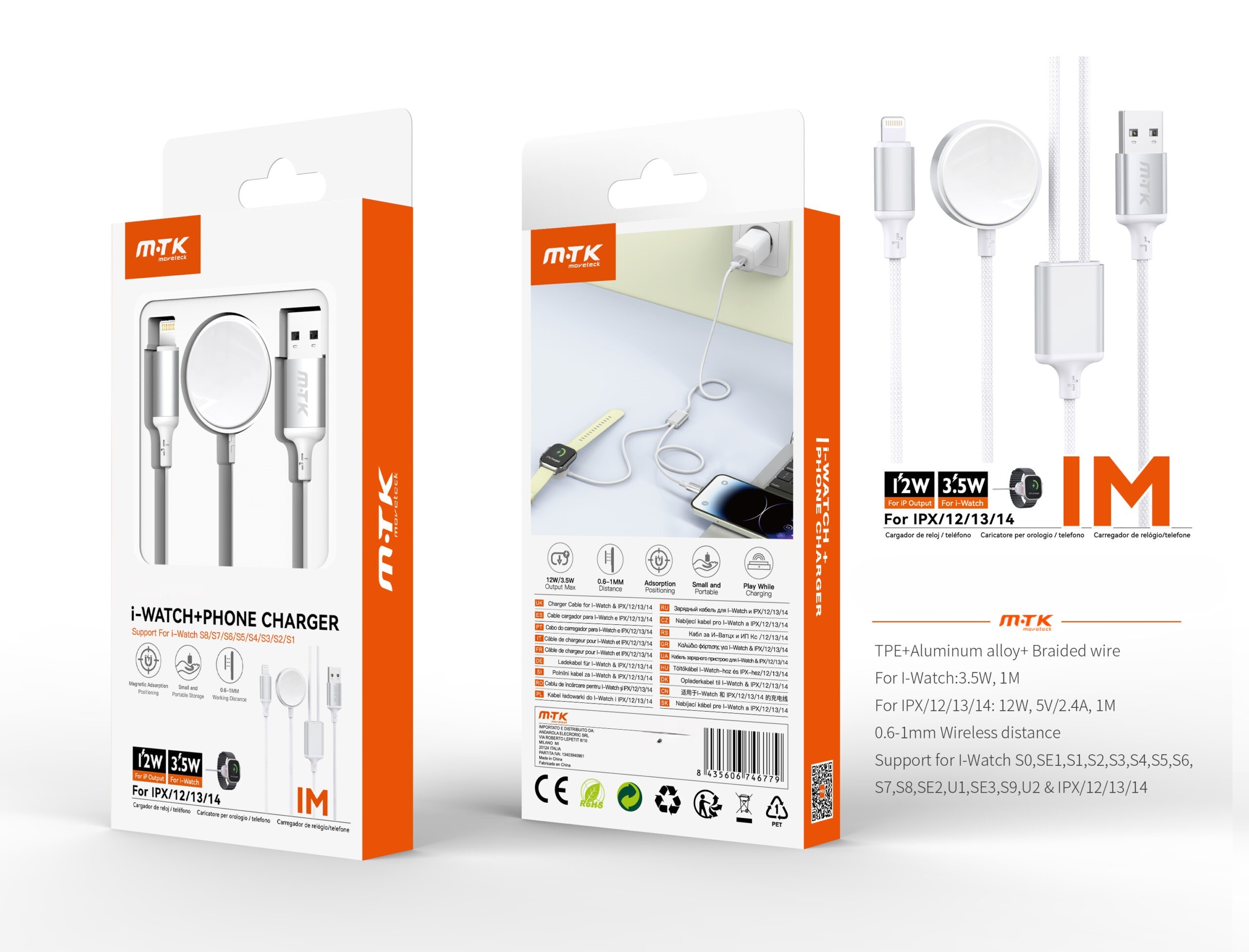 Cargador Watch 2 en 1, con cargador Magnético 3.5W + cable trenzado LITGHTING 60w, Cable 1m, Blanco. Cable Tipo.C