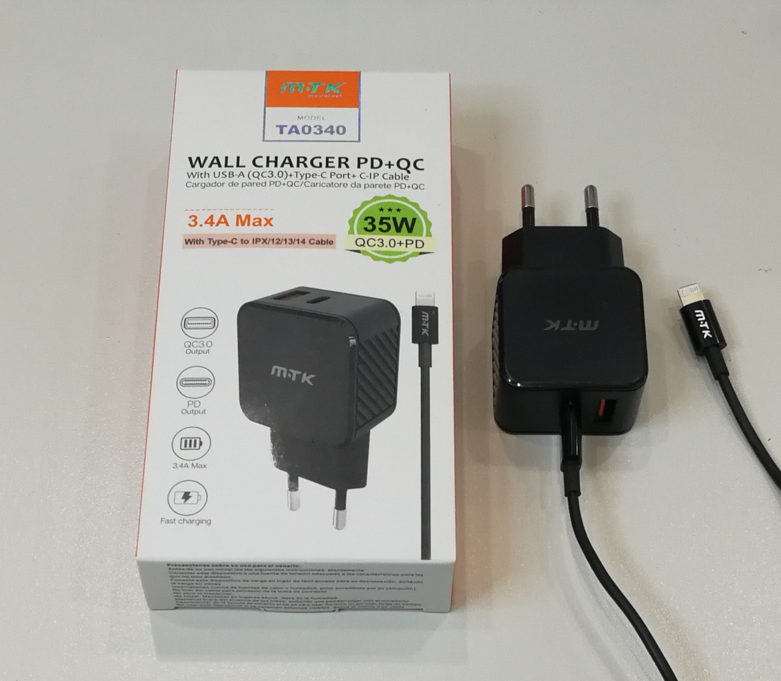 Cargador de red 35W 3,4A Model:TA0340 Entrada: 110-240v – 50/60hz 0.8a max Salida: USB-(QC3.0) DC5,0V 3,4A/9,0V/2,0A/12,0V 1,5A