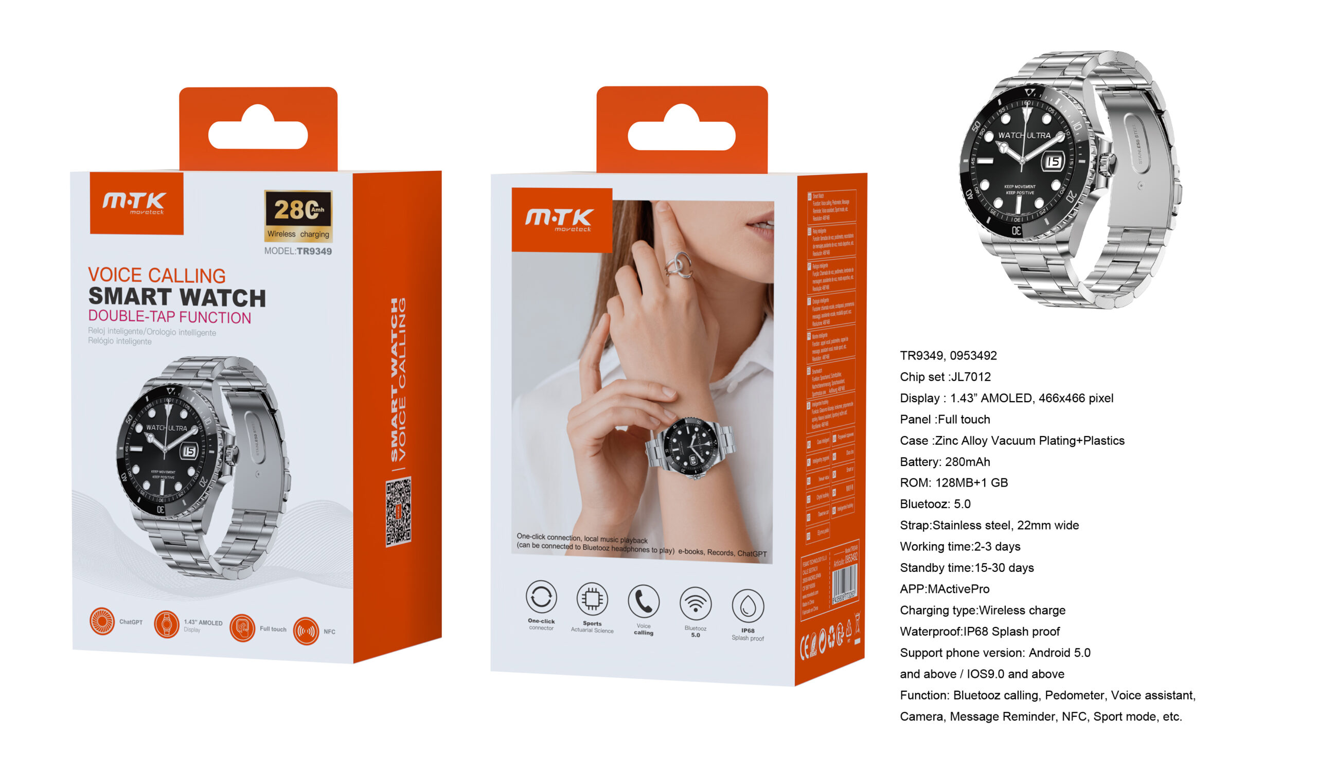 TR9349 Reloj Inteligente con bluetooth, Pantalla 1.43 Pulgadas, IP68, Soporta NFC de Puerta Inteligente Bateria 280mAh, Plata+Negro