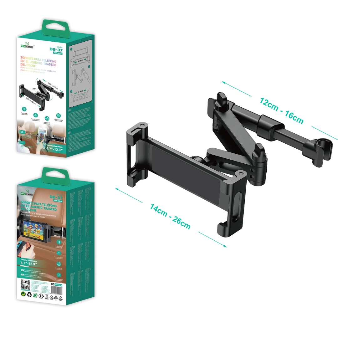 Convierte los viajes largos en momentos de entretenimiento con este soporte universal para el asiento trasero del coche. Compatible con dispositivos de 4.7” a 12.9”, su diseño ajustable (14–26 cm de ancho y 12–16 cm de profundidad) permite adaptarse a la mayoría de smartphones y tablets del mercado. Fabricado con materiales resistentes y duraderos, ofrece rotación de 360°, garantizando el ángulo de visión perfecto para niños y pasajeros. Su instalación es rápida y segura en los postes del reposacabezas.